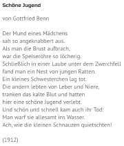 | 09:06, 13. Aug. 2022 | Benn schöne Jugend .png (Datei) | 106 KB | DiMedS (Diskussion | Beiträge) | Gottfried Benn: Schöne Jugend | 1 | |